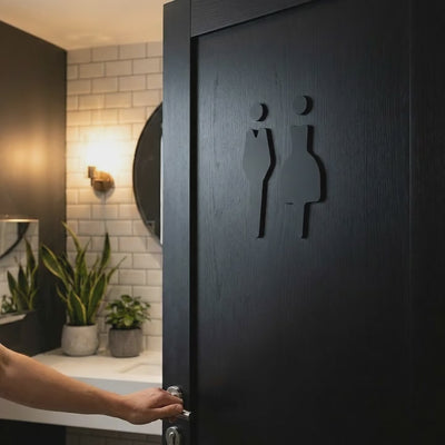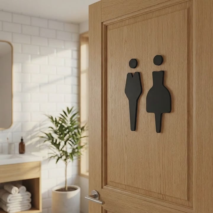 Sophisticated signage for modern spaces. This minimalist male & female toilet sign combines premium black stone texture acrylic with precision-cut gender symbols, creating an elegant...